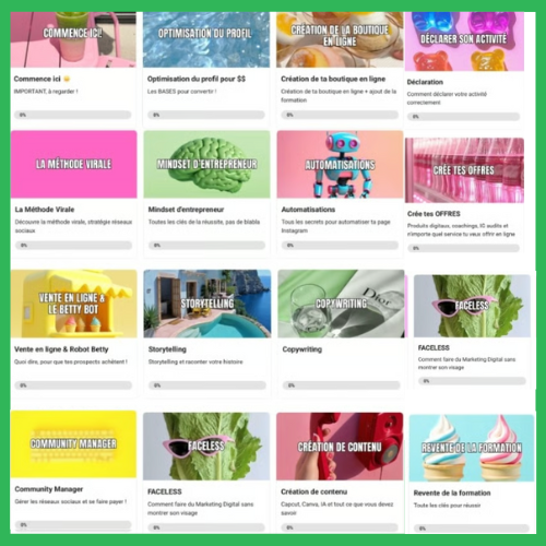 Tu y retrouveras tous les modules, ressources et outils essentiels, ainsi qu’une communauté active d’entrepreneurs partageant les mêmes objectifs que toi.